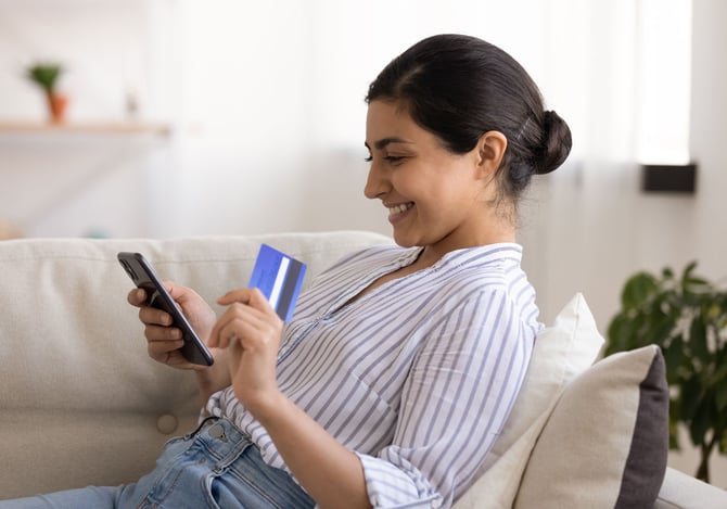 Uma mulher deitada em um sofá segurando um telefone celular e um cartão de crédito